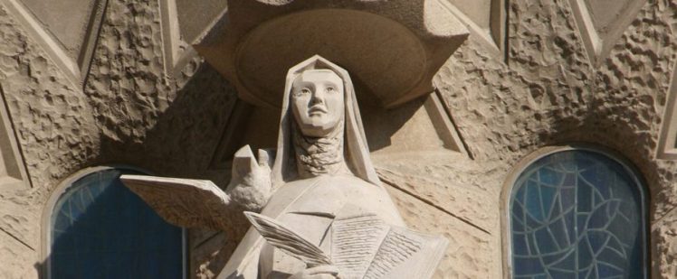De este monumental templo, nos fijamos hoy en una figura que, desde la altura, nos contempla. La fachada del ábside, entre las fachadas del Nacimiento y la Pasión, contiene abundante decoración escultórica, donde destacan los santos fundadores de órdenes religiosas: S. Francisco, santa Clara, S. Bruno, S, Bernardo, S. Benito… y Santa Teresa.
