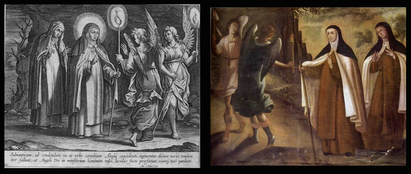 Adriaen Collaert (c.1560-1618) y Cornelis Galle I (1576-1650) diseñaron una serie de 24 grabados sobre la vida de santa Teresa. Esta serie fue publicada en Antwerp en 1613, y fue objeto de múltiples ediciones en 1622 y, supuestamente, en 1677. Sirvió de base a una serie de 16 pinturas ejecutadas por José Espinoza de los Monteros en 1682. Estas pinturas cuelgan ahora en la Iglesia del Convento de los Carmelitas de Cuzco, Perú.Aparecen en la galería las correspondencias entre os grabados de la serie de Collaert-Galle y la colección de obras de José Espinoza de los Monteros. |