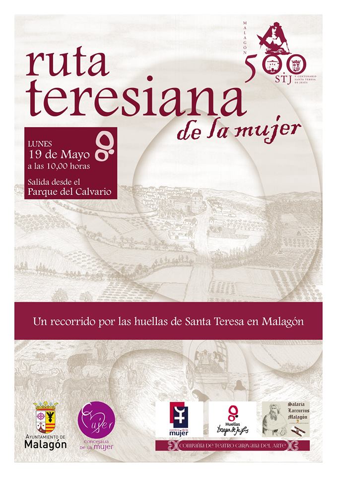 El próximo lunes 19 de mayo, y organizado por la Concejalía de la Mujer del Excmo. Ayuntamiento de Malagón, tendrá lugar la realización de un Itinerario urbano por la localidad que recorrerá diversos lugares relacionados con la estancia de Santa Teresa de Jesús y su III Fundación que, como es sobradamente conocido, fue llevada a cabo en el año 1568.