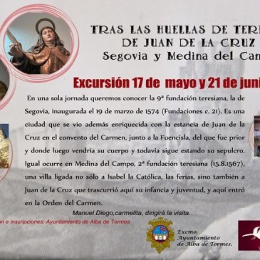 El Ayuntamiento de Alba de Tormes, en el marco del programa ‘Huellas de Teresa de Jesús’, organiza de nuevo -el próximo 21 de junio- una visita a Segovia y Medina del Campo para recorrer los lugares que marcaron la vida de la Santa de cuyo nacimiento están a punto de conmemorarse 500 años.El 17 de … More Desde Alba, «Tras las huellas de Teresa y Juan de la Cruz»