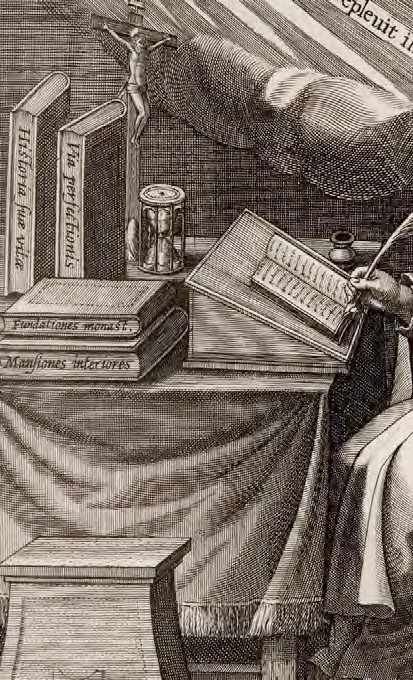 Al fondo, destacada, una imagen decisiva en la “conversión” que nos cuenta Teresa: un Cristo llagado; el conmovedor “Ecce Homo” de Albert Bouts, la obra que la propia santa regaló al convento de las Carmelitas Descalzas de Toledo: “entrando un día en el oratorio, vi una imagen […]. Era de Cristo muy llagado”; ella se turba al verlo “porque representaba bien lo que pasó por nosotros”, Vida, 9, 1.