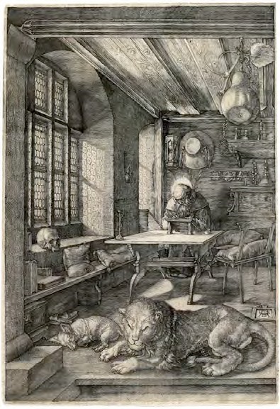 Enseguida dos obras maestras: “El Salvador bendiciendo” de Zurbarán y “San José y el Niño Jesús” de Ribera, porque El Salvador y san José –cuidando al Niño y a la Virgen– serán sus dos apoyos siempre; Teresa dará el nombre de san José a todas sus fundaciones. Y paralelamente los libros: ahora los que le marcaron hondamente, el Tercer abecedario espiritual de Francisco de Osuna y las Confesiones de san Agustín, junto con otros textos espirituales que ella nombra como lecturas suyas. Una escultura de San Agustín de Gregorio Fernández subraya la importancia del santo y de su obra para Teresa: “Yo soy muy aficionada a san Agustín”, “Como comencé a leer las Confesiones paréceme me vía yo allí”, Vida, 9, 7-‐8. A continuación, la maravillosa estampa de “San Jerónimo en la celda” de Alberto Durero, de la Biblioteca Nacional, evoca otra de sus lecturas.