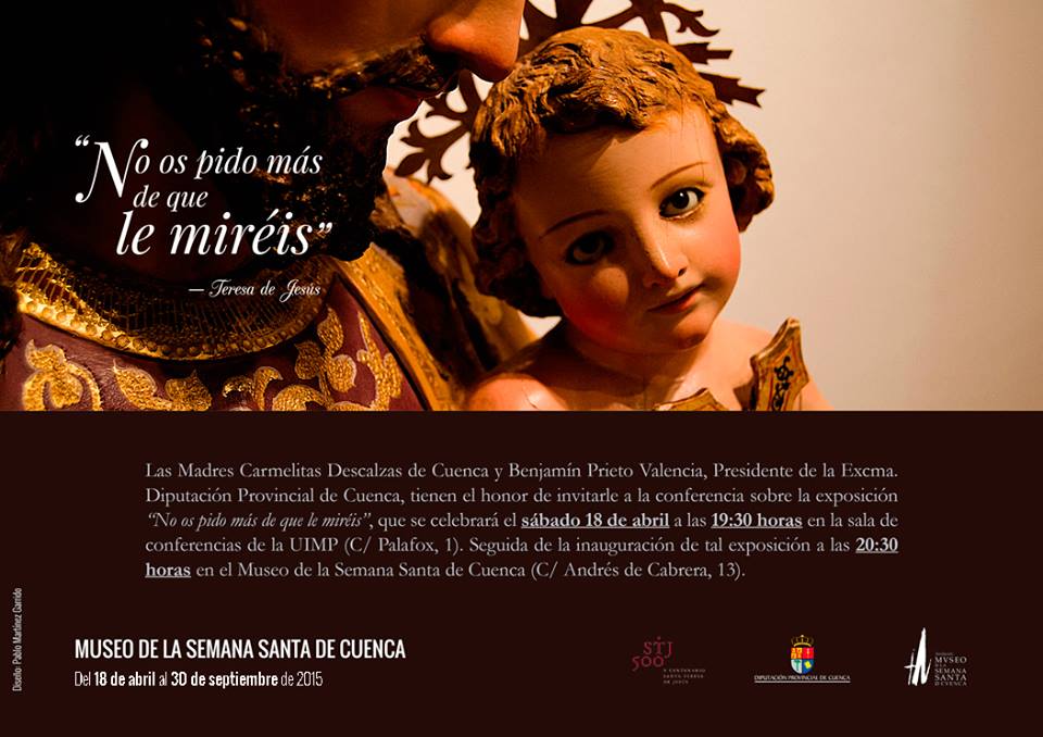 El vicario general del Carmelo Descalzo, P. Emilio Martínez, ha inaugurado este sábado 18 de abril en el Museo de la Semana Santa de Cuenca la exposición «No os pido más de que le miréis», dedicada a Santa Teresa de Jesús dentro del programa de actos del V centenario de su nacimiento y que estará abierta hasta el 30 de septiembre.