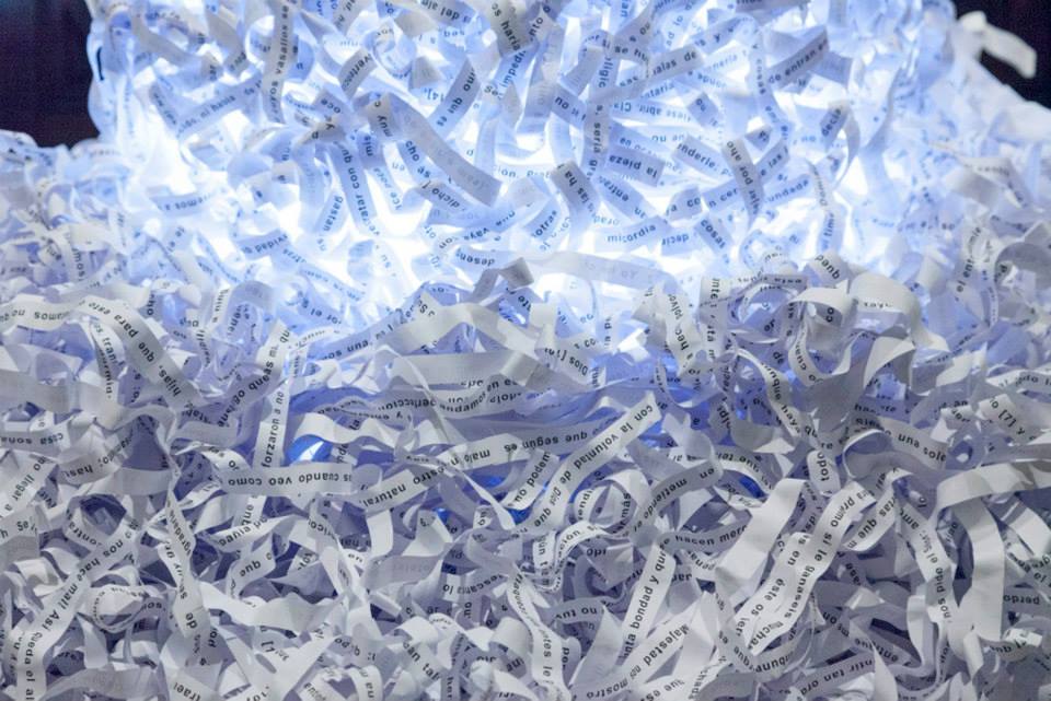 La autora ha tardado dos meses en crear esta pieza (en torno a 100 horas de trabajo), el mismo tiempo que tardó Teresa en escribir las Moradas. Una larga tira serigrafiada, colocada en la pared, a la altura de la vista, y rodeando la instalación incluirá (por orden alfabético) todas las palabras que hay en las Moradas, indicando el número de veces que se repite a lo largo del texto.