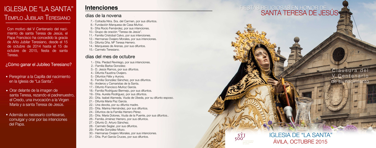 Por su parte, los carmelitas descalzos, en la casa natal de la Santa, celebran la fiesta de santa Teresa de Jesús y clausuran el año jubilar teresiano con un programa al que se puede acceder en este enlace.