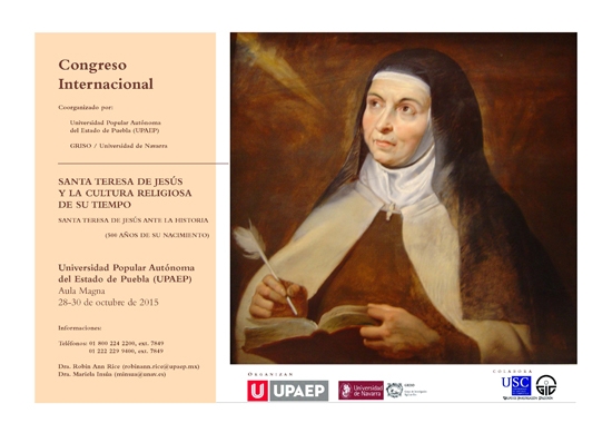 Se ha publicado ya el programa del Congreso Internacional «Santa Teresa y la cultura religiosa de su tiempo. Santa Teresa de Jesús ante la historia (500 años de su nacimiento)», que tendrá lugar en Puebla (México) los días 28-30 de octubre de 2015. Ha sido coorganizado por la Universidad Popular Autónoma del Estado de Puebla (UPAEP) y el Grupo de Investigación Siglo de Oro (GRISO) de la Universidad de Navarra, en colaboración con el Grupo de Investigación Calderón (GIC) de la Universidade de Santiago de Compostela. Los Directores del Congreso son Robin Rice (UPAEP) e Ignacio Arellano (GRISO-Universidad de Navarra).