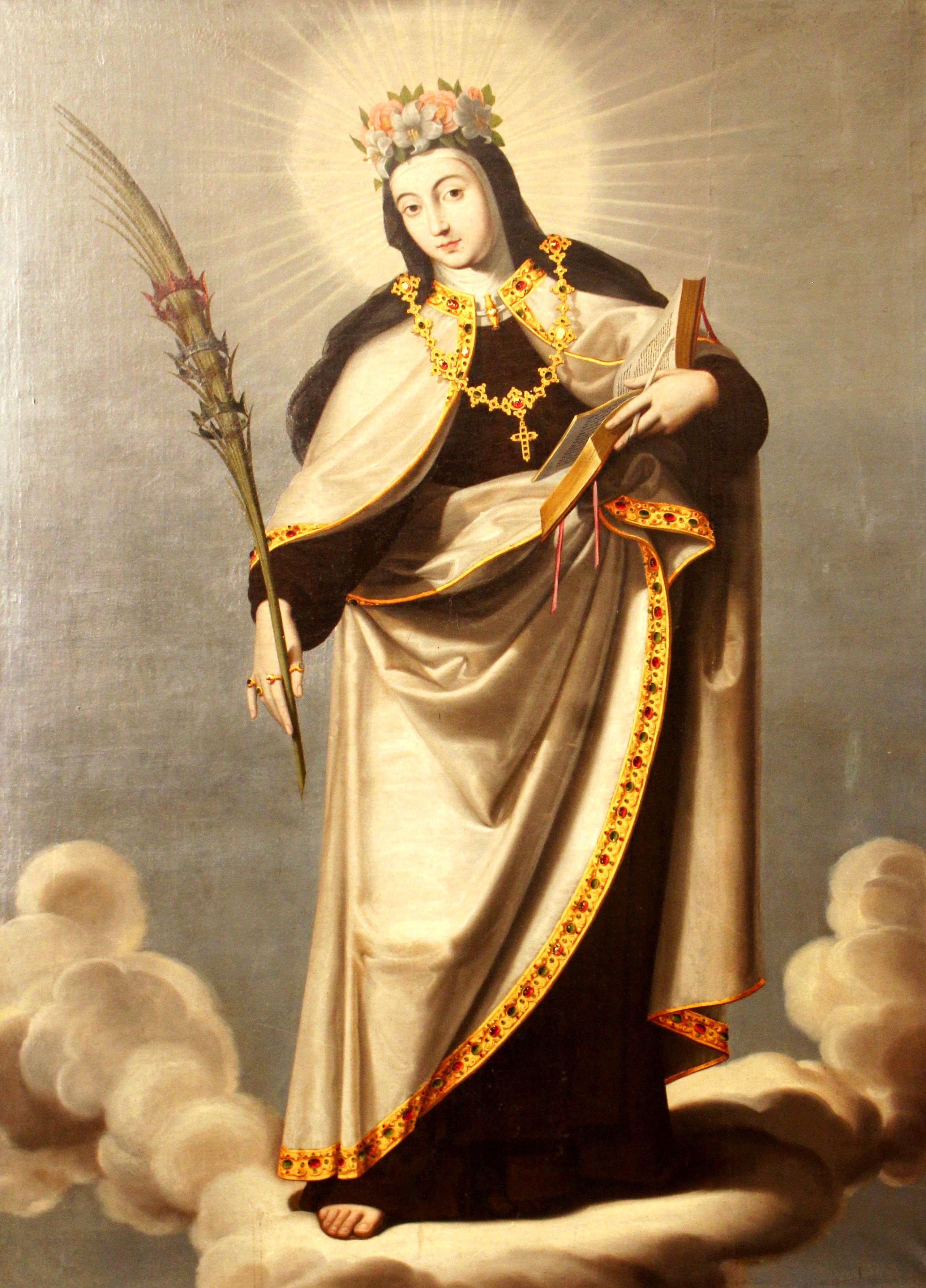 Palencia. Monasterio de San José de MM. Carmelitas Descalzas.De una notable calidad es el lienzo que podría titularse como la Gloria de Santa Teresa perteneciente a un tipo iconográfico muy desarrollado en el siglo XVII, mostrando a los santos en apoteosis, transmitiendo un mensaje claro y grandilocuente que ensalza su elevación espiritual y sus virtudes. Por ello se la representa de pie, sobre un trono de nubes, mirando al espectador y refulgente con su aureola de santidad. Lleva el collar dorado con rica pedrería corlada, que se repite en las borduras del manto de reformadora. Sobre sus sienes ciñe una corona floral, símbolo de virginidad y gloria, mientras que en la mano izquierda porta el libro y la pluma de escritora. En la derecha sujeta una palma, con las tres coronas como las tres grandes virtudes: desasimiento, amor fraterno y humildad. El desasimiento es fuente de libertad y señorío, excluye la posesión y el acaparamiento que esclaviza. En frase de la Santa: “Solo Dios basta” (Poesías). Amor fraterno de unas con otras, “aquí todas han de ser amigas, todas se han de amar, todas se han de ayudar” (Camino de Perfección 6, 4). La humildad pone cada ser y cada cosa en relación con la Persona de Jesús. Conocida es la frase de la Santa “humildad es andar en verdad” (Moradas VI 10, 7). La palma con las tres coronas aparece en la iconografía de otros santos, asociada al martirio, que en Santa Teresa siempre estuvo relacionado con su “martirio espiritual”. Es esta una iconografía poco estudiada pero de la que conservamos varias réplicas, lo que indica una común fuente grabada. Otro lienzo muy semejante (aunque de diversa factura) se conserva en el Museo de la Santa de Ávila, titulado por la inscripción que presenta como Santa Teresa Patrona de España. En escultura, puede vincularse levemente con las representaciones fernandescas de la Santa.