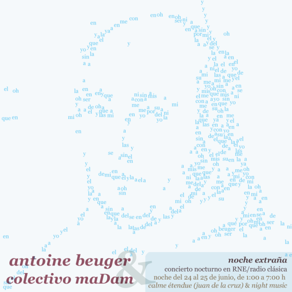 En este concierto el Colectivo maDAm interpretará, de forma simultánea, dos obras del compositor holandés Antoine Beuger: Night music y Calme étendue (Juan de la Cruz).