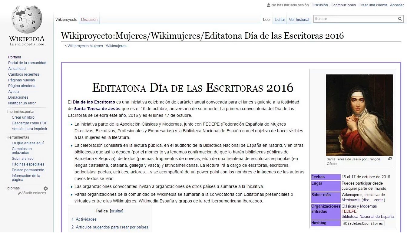 Como una actividad complementaria al Día de las Escritoras, la Biblioteca Nacional de España, la Asociación Clásicas y Modernas, la Federación Española de Mujeres Directivas, Ejecutivas, Profesionales y Empresarias (FEDEPE) y Wikimedia España, han organizado el sábado 15 de octubre una editatona sobre escritoras con el objetivo de hacer visibles a las mujeres y su obra en la literatura.