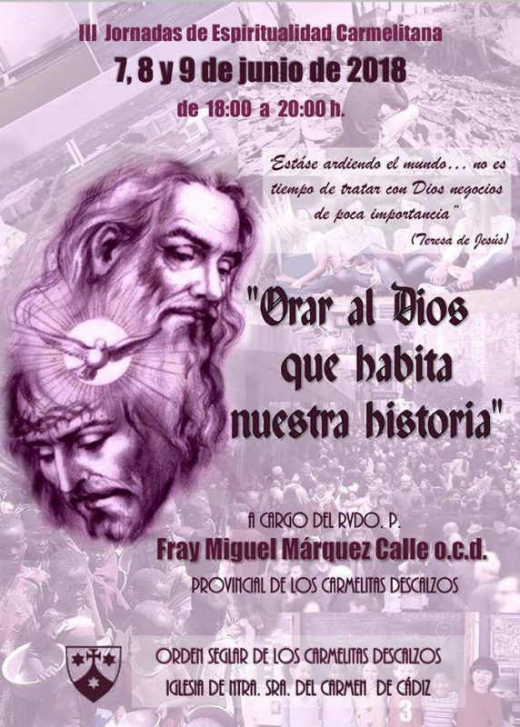 Un año más, el Carmelo Descalzo Seglar de Cádiz organiza las Jornadas de Espiritualidad Carmelitana. Este año son las terceras, y estarán a cargo del P. Miguel Márquez, superior de los carmelitas descalzos de la Provincia Ibérica. El tema elegido es: Orar al Dios que habita nuestra historia. Se celebrarán los días 7, 8 y 9 de junio 2018, de 18h a 20h. en la Iglesia de Nuestra Señora del Carmen de Cádiz.