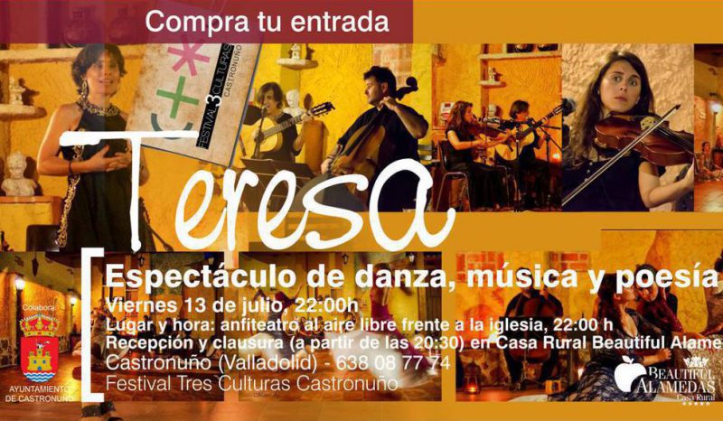 “Teresa” es un montaje de poesía, danza y música en directo que une a diferentes actrices, bailarinas y músicos. Con la vida y la obra de Santa Teresa como argumento e hilo conductor, “Teresa” es un montaje que cuenta con la conocida actriz Elvira Heras… más las tres bailarinas de la compañía UnSolTraç (Virginia Joëlle, Rut Rigat y Dori Bermúdez). De la música en directo se encarga el grupo Burruezo & Medievalia Camerata, liderado por el cantante y compositor Pedro Burruezo, formación que cuenta también con la cantante y violista Maia Kanaan y el chelista Jordi Ortega. Teatro, danza y música se unen, pues, en este montaje multidisciplinar para rendir homenaje a aquella monja de origen sefardí que fue subiendo peldaños en el escalafón espiritual hasta llegar a las más altas cumbres de la mística. Textos, danzas y músicas nos acercan a esta mujer enamorada de lo divino con un montaje tan profundo como exquisito. Tanto Elvira Heras como las bailarinas como los músicos, tienen una dilatadísima carrera que les ha llevado a actuar por medio mundo.