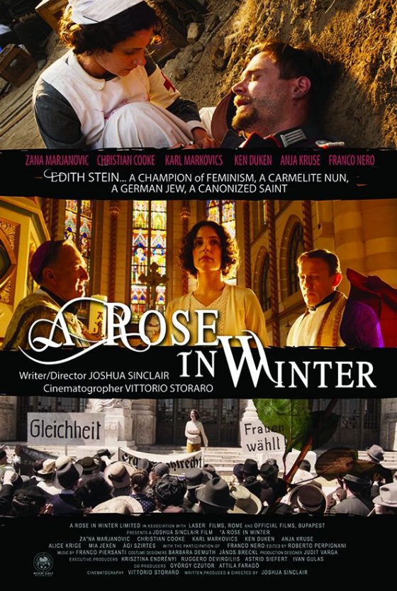 Rodada por el tres veces ganador del Premio de la Academia Vittorio Storaro (Apocalypse Now) y entrelazando temas como el amor, el coraje, la religión, el feminismo y la tragedia del Holocausto, A Rose in Winter (2018, 104 min.) —escrita y dirigida por Joshua Sinclair, y protagonizada por Zana Marjanovic— cuenta la extraordinaria historia de Edith Stein, nacida en una familia judía observante, que optó por ingresar a la Iglesia Católica como adulta, se convirtió en una monja carmelita descalza, y años después desafió a la Santa Sede a luchar contra el Holocausto. Tras huir a Holanda, fue capturada y enviada por los nazis al campo de Westerbork, donde un oficial no judío, impresionado por su fe y su calma, le ofreció un plan para escapar. Edith rechazó vehementemente su ayuda, expresándole que ahora compartiría el destino de sus hermanos y hermanas, un camino que la llevaría a la muerte en Auschwitz. En 1998, el Papa Juan Pablo II la canonizó y la nombró copatrona de Europa.