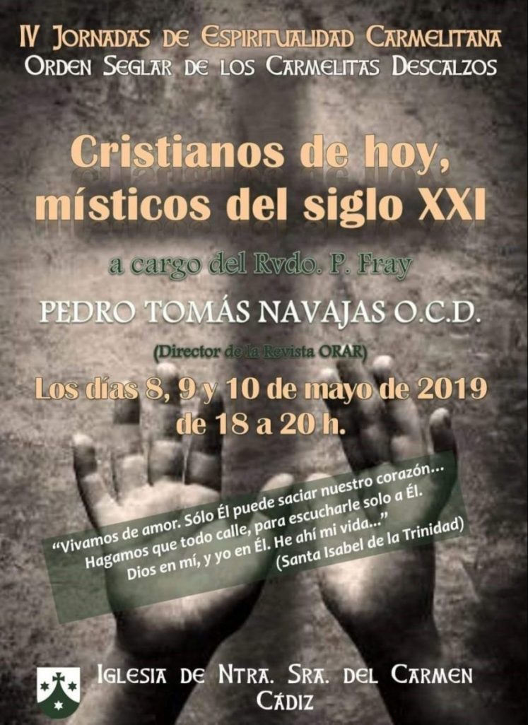 El Carmelo Descalzo Seglar de Cádiz organiza las IV Jornadas de Espiritualidad Carmelitana. Este año, están a cargo del P. Pedro Tomás Navajas, o.c.d., director de la revista Orar. Serán los días 8, 9 y 10 de mayo de 2019, de 18h a 20h. en la Iglesia de Nuestra Señora del Carmen de Cádiz. El tema elegido: «Cristianos de hoy, místicos del siglo XXI».