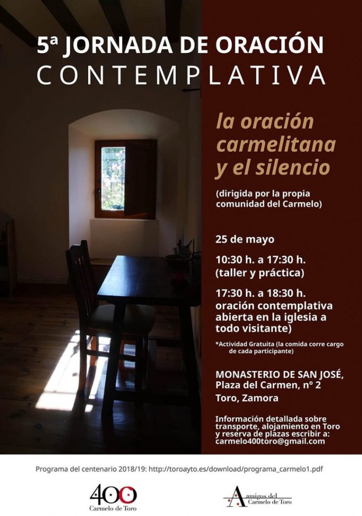 El próximo sábado 25 de mayo tendrá lugar en el Carmelo de Toro (Zamora) la Quinta Jornada de oración contemplativa, dedicada, en esta ocasión, al tema de «la oración carmelitana y el silencio».