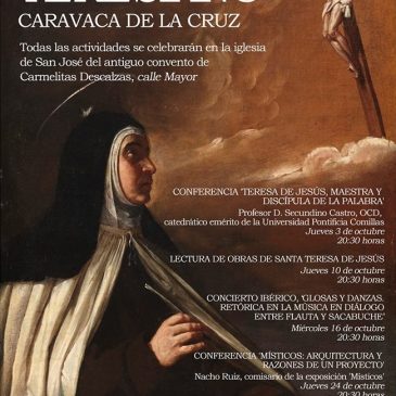 El IV Ciclo Teresiano de Caravaca de la Cruz, organizado conjuntamente por la Concejalía de Cultura del Ayuntamiento y la comunidad de Carmelitas Descalzos, se celebrará los días 3, 10, 16 y 24 de octubre en la iglesia de San José del antiguo convento de las Carmelitas Descalzas, en la calle Mayor. El ciclo tiene … More IV Ciclo Teresiano en Caravaca de la Cruz