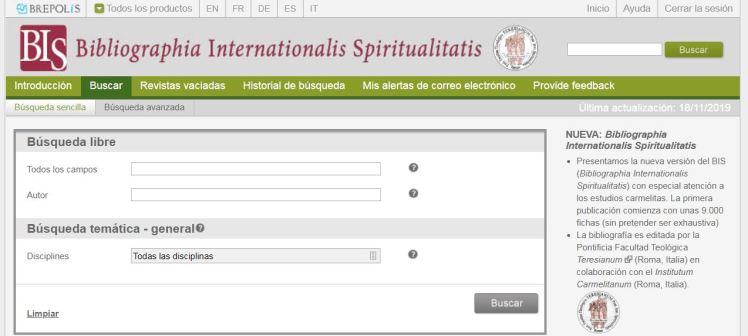 El BIS (Bibliographia Internationalis Spiritualitatis) ofrece una bibliografía académica en teología espiritual, estudios carmelitas y antropología teológica y es propuesto por la Facultad Pontificia Teológica Teresianum en cooperación con el Institutum Carmelitanum, ambos con sede en Roma. La primera publicación en 2019 comienza con unas 9.000 entradas bibliográficas e incluye la bibliografía desde 2007.