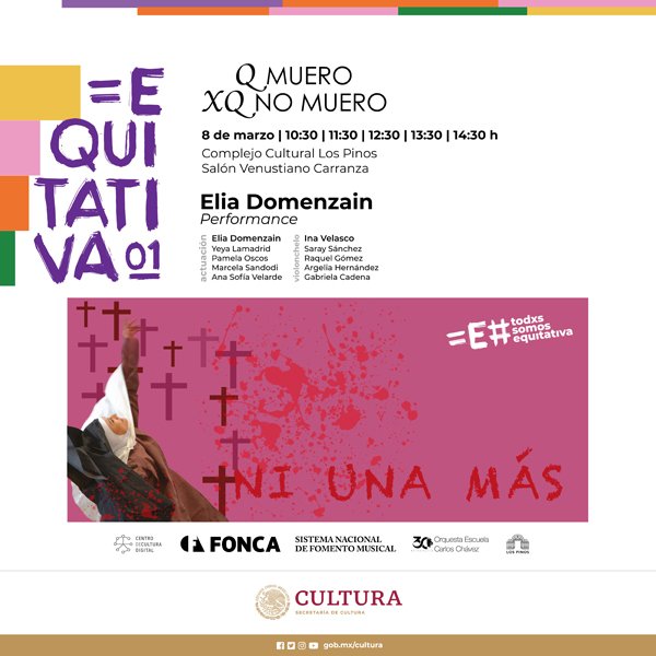 Con motivo del Día de la Mujer, se presenta, en la Ciudad de México, esta performance titulada «Q muero xq no muero», de Elia Domenzain. En ella, una actriz y una violonchelista de la Orquesta Escuela Carlos Chávez, invitarán al público a reflexionar cómo bajo el ‘hábito de modales’ que ha dictado la sociedad a la mujer, se ocultan heridas y emociones que necesitan ser liberadas.