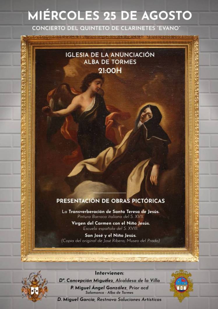En el marco de las fiestas de la Transverberación de santa Teresa, que se celebran en el Convento de la Anunciación de las Carmelitas Descalzas de Alba de Tormes del 25 al 27 de agosto, este templo acogerá un acto cultural. Se celebrará el miércoles 25 de agosto a las 21:00 horas, y consistirá en un concierto musical a cargo del quinteto de clarinetes Évano de Alba de Tormes y en la presentación de tres obras pictóricas de los siglos XVII y XVIII donadas recientemente al museo Carmus. ‘La Transverberación de Santa Teresa de Jesús’, ‘La Virgen del Carmen con el Niño Jesús’ y ‘San José y el Niño Jesús’.