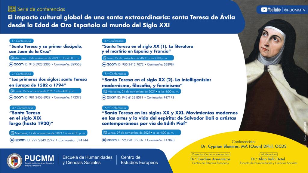 La Pontificia Universidad Católica Madre y Maestra (PUCMM) de la República Dominicana ha organizado un ciclo de seis conferencias sobre santa Teresa impartidas por el Dr. Cyprian Blamires, ocds, historiador de las ideas.