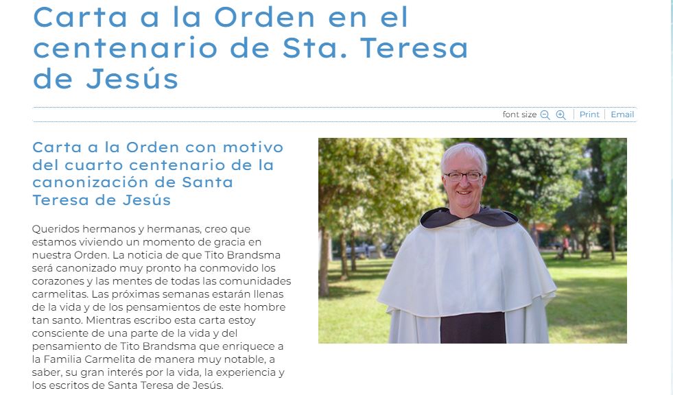 Queridos hermanos y hermanas, creo que estamos viviendo un momento de gracia en nuestra Orden. La noticia de que Tito Brandsma será canonizado muy pronto ha conmovido los corazones y las mentes de todas las comunidades carmelitas. Las próximas semanas estarán llenas de la vida y de los pensamientos de este hombre tan santo. Mientras escribo esta carta estoy consciente de una parte de la vida y del pensamiento de Tito Brandsma que enriquece a la Familia Carmelita de manera muy notable, a saber, su gran interés por la vida, la experiencia y los escritos de Santa Teresa de Jesús.