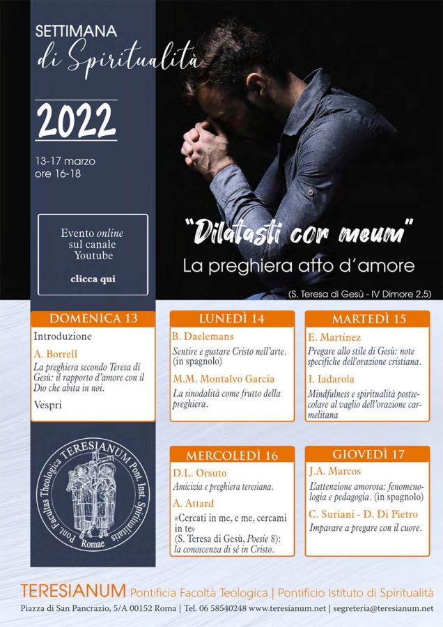 Ha concluido la 63ª Semana de Espiritualidad organizada por la facultad de Teología del Teresianum (Roma). Este año, con motivo de los 400 años de la canonización de Teresa de Jesús, ha estado centrada en mensaje teresiano de la oración como amistad, como acto de amor. Ofrecemos, a continuación, los videos de todas las ponencias. La primera conferencia del jueves, a cargo de Juan Antonio Marcos, es en español el resto, en italiano.