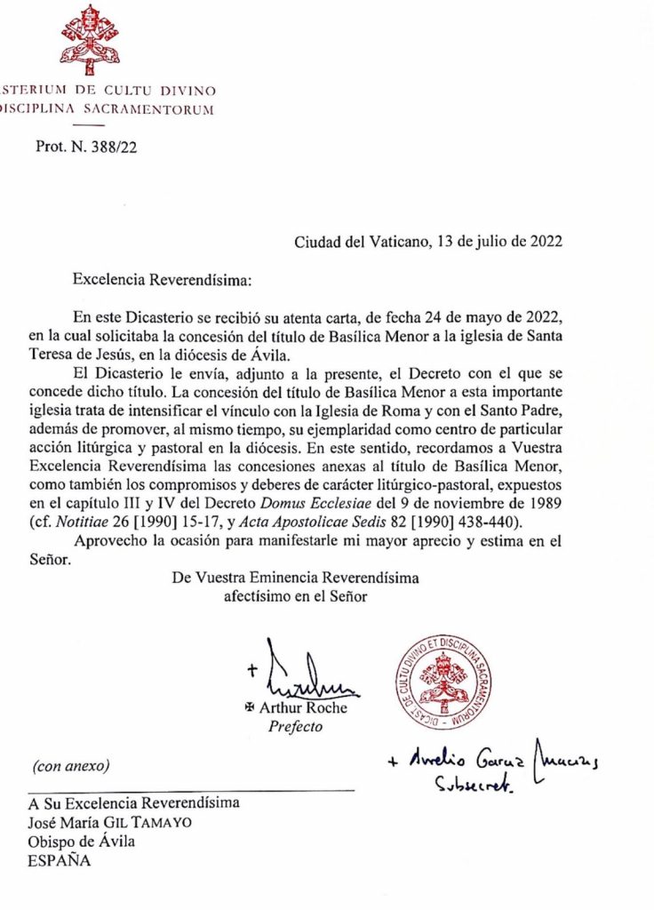 Ya es oficial. La iglesia de la Santa será considerada Basílica Menor. Tras la petición formal realizada al Vaticano por Mons. Gil Tamayo, respaldada con los informes y datos aportados por la Orden del Carmelo, el Nuncio de Su Santidad en España acaba de hacer llegar al Administrador Apostólico de Ávila el Decreto por el que se confiere este título “a la iglesia conventual de Santa Teresa de Jesús, edificada sobre la casa natal de la Santa abulense”. Un templo descrito por el propio Nuncio Apostólico en su carta como “este lugar sagrado tan importante para la Diócesis de Ávila y la Iglesia universal”.