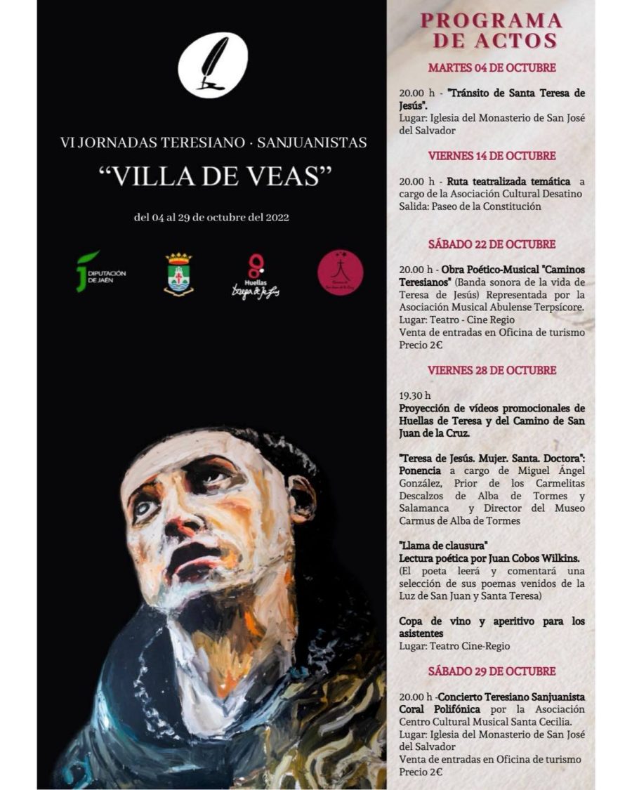 Como ya viene siendo habitual, Beas de Segura (Jaén) dedica este mes de octubre a recordar las figuras de Santa Teresa de Jesús y San Juan de la Cruz a través de las VI Jornadas Teresiano – Sanjuanistas Villa de Veas. Os dejamos el cartel con la programación prevista para la celebración de estas; una programación que, a través de la palabra, la música y el teatro nos enseñará un poco más de la vida y obra de nuestros místicos