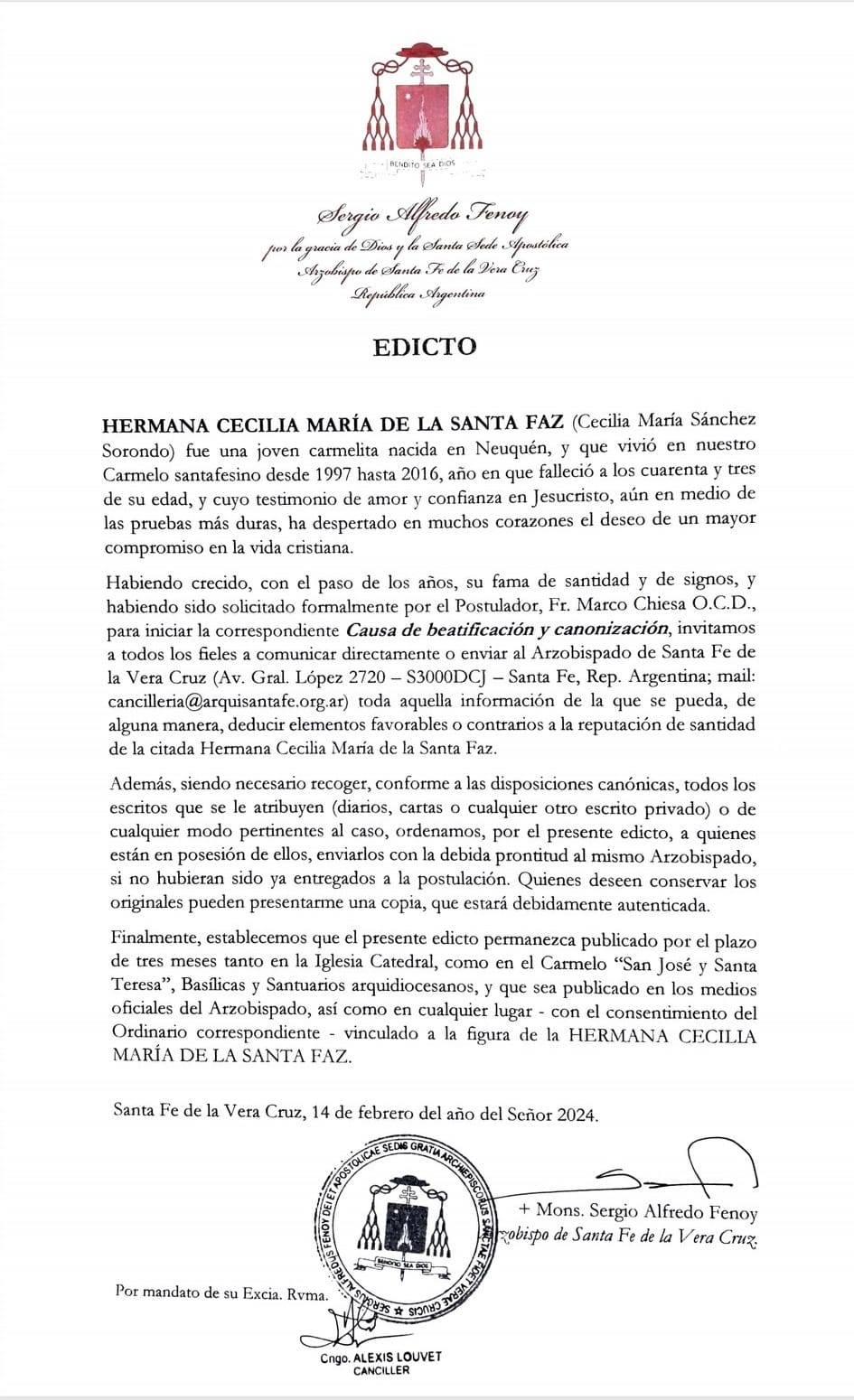En el edicto, se invita a todos los fieles a comunicar por correo electrónico: cancilleria@arquisantafe.org.ar o enviar al arzobispado de Santa Fe de la Vera Cruz (Av. Gral. López 2720, Santa Fe) toda aquella información de la que se pueda, de alguna manera, deducir elementos favorables o contrarios a la reputación de santidad de la citada Hermana Cecilia María de la Santa Faz.