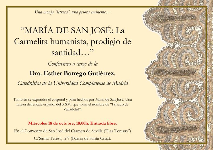 El canal de YouTube de las carmelitas descalzas de Sevilla nos ofrece esta conferencia sobre María de San José, pronunciada en el Carmelo femenino de la ciudad hispalense el 18 de octubre de 2023. Corre a cargo de la profesora Esther Borrego, catedrática de Literatura de la Universidad Complutense de Madrid y directora de Mulier Fortis, Mulier Docta, Proyecto I+D. Hibridismo literario y resistencia en las comunidades carmelitas posteresianas (siglos XVI–XVII).