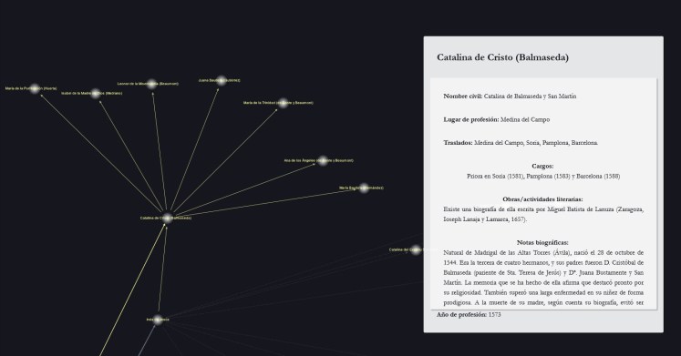 Este pequeño proyecto de Humanidades Digitales ha nacido en Sevilla de la mano de un equipo multidisciplinar formado jóvenes investigadores y por ingenieros de software, los cuales se han propuesto crear una herramienta de sistematización y visualización de datos en forma de “árbol genealógico” o grafo de relaciones, todo ello para apoyar el estudio de la historia y la literatura del carmelo descalzo femenino.