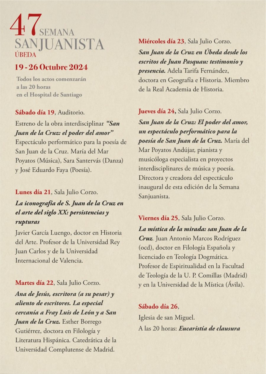 Todos los actos comenzarán a las 20 horas en el Hospital de Santiago. Las Conferencias serán presenciales en el Auditorio del Hospital de Santiago y retransmitidas a través del canal de YouTube de la UNED JAÉN y el de los CARMELITAS DESCALZOS ÚBEDA.