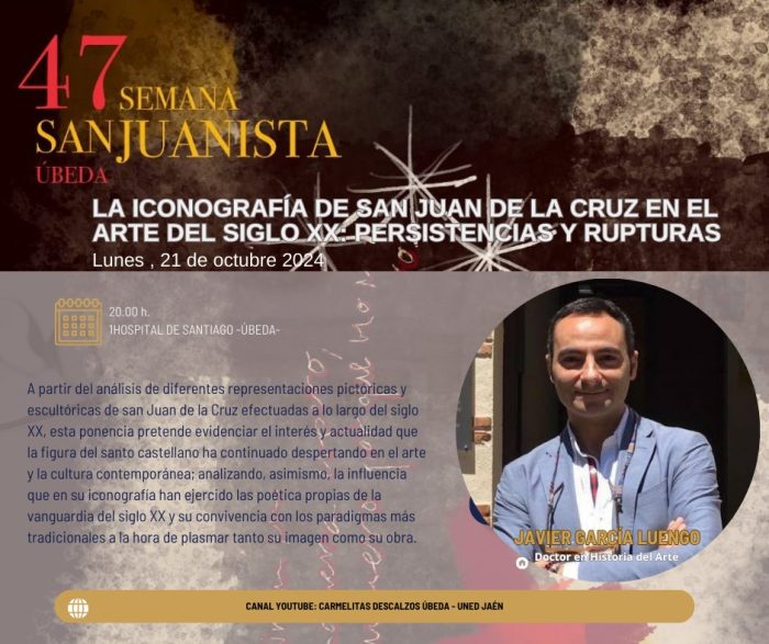 Dentro de la programación de la 47ª Semana Sanjuanista de Úbeda, este lunes 21 de octubre, a las 20h. tendrá lugar la conferencia titulada: La iconografía de S. Juan de la Cruz en el arte del siglo XX: persistencias y rupturas. Corre a cargo de Javier García Luengo, doctor en Historia del Arte. Profesor de la Universidad Rey Juan Carlos y de la Universidad Internacional de Valencia.