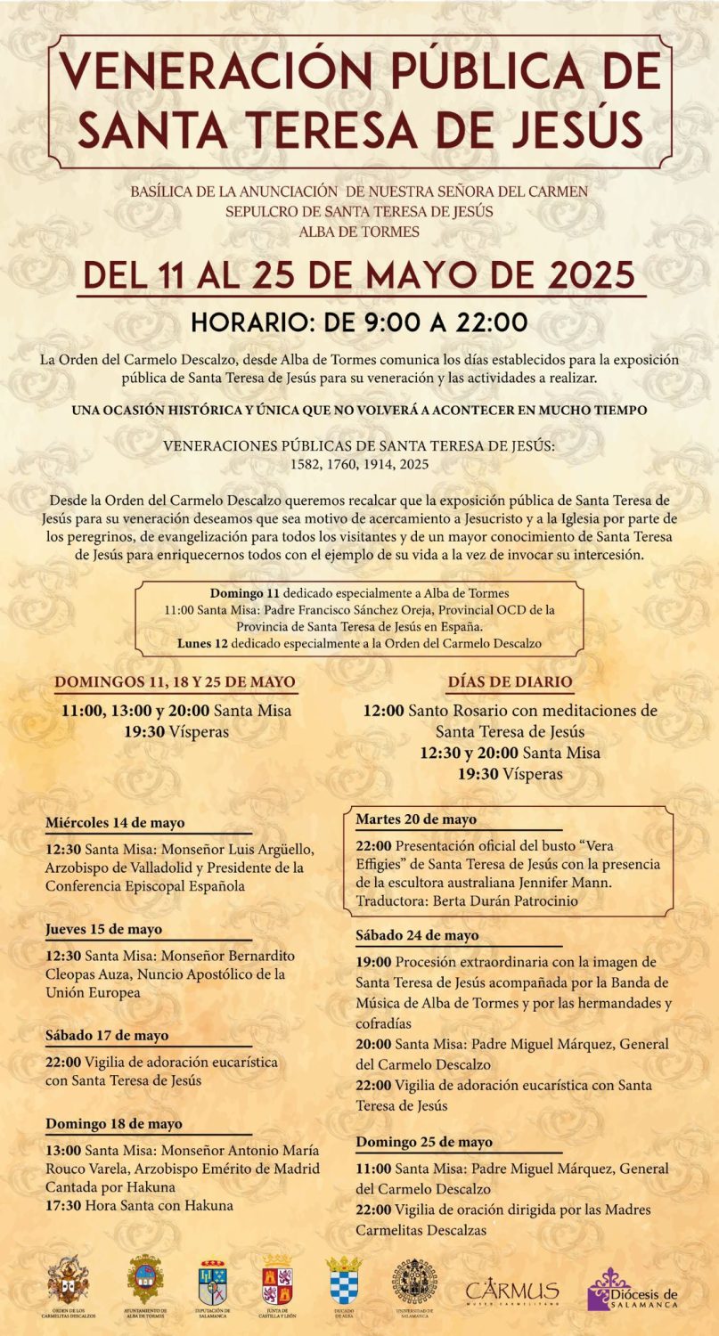 Del 11 al 25 de mayo, la Basílica de la Anunciación de Nuestra Señora del Carmen, en Alba de Tormes, acogerá un acontecimiento extraordinario: la veneración pública del cuerpo de santa Teresa de Jesús. Se trata de un hecho que solo ha tenido lugar en tres ocasiones desde su muerte en 1582: en 1760, en 1914 y ahora, en 2025. La comunidad del Carmelo Descalzo nos invita a vivir este tiempo como una oportunidad única de encuentro con el mensaje teresiano, en el mismo lugar donde reposan sus restos.