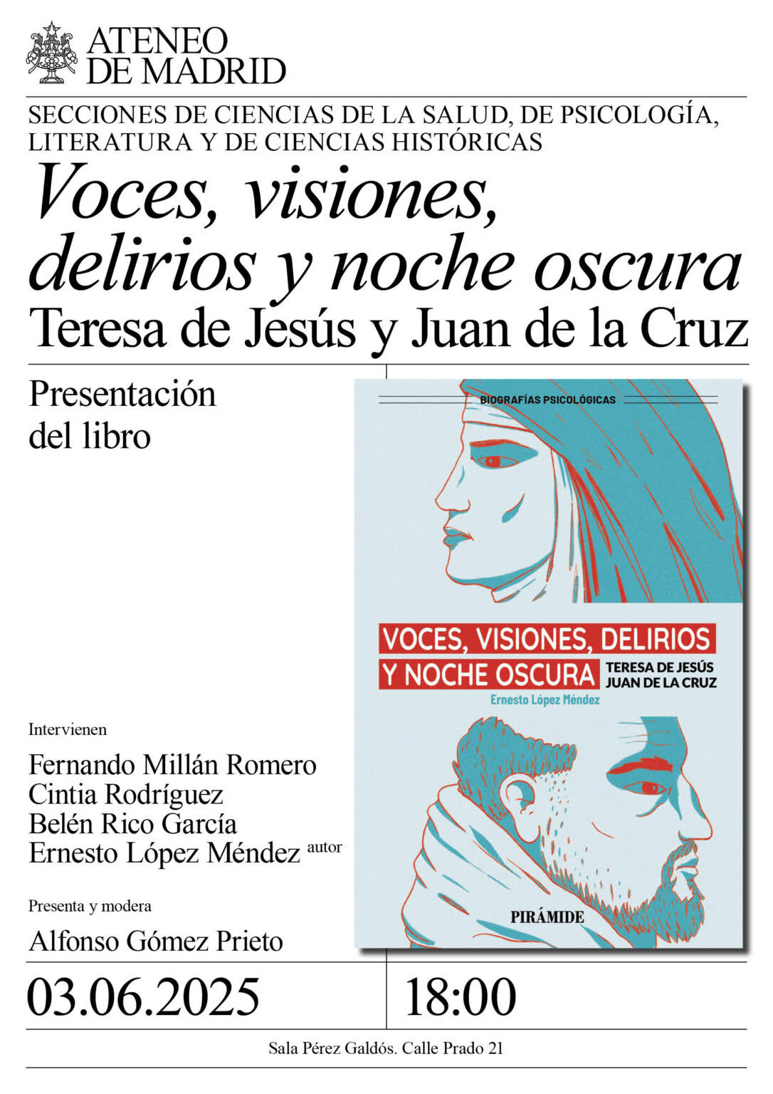 Este martes 3 de junio de 2025, a las 18:00 h, se celebrará en el Ateneo de Madrid la presentación del libro Voces, visiones, delirios y noche oscura. Teresa de Jesús y Juan de la Cruz, escrito por Ernesto López Méndez y publicado por la editorial Pirámide.