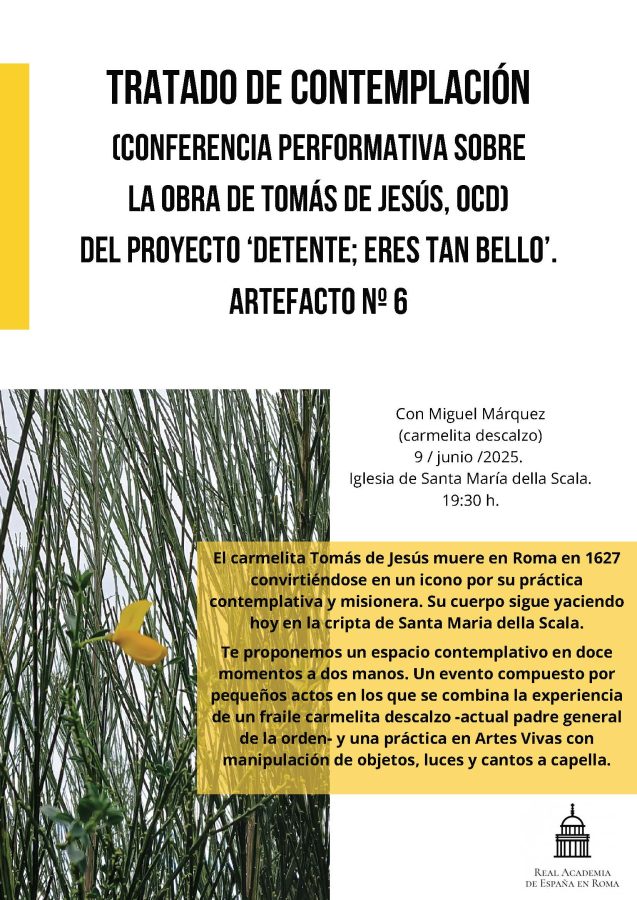 El evento dedicado a Tomás de Jesús será una conferencia performativa titulada “Tratado de Contemplación”, que tendrá lugar el 9 de junio de 2025, a las 19:30 h, en la iglesia de Santa Maria della Scala. Esta experiencia, que combina la palabra, el canto y la práctica escénica, la llevan a cabo conjuntamente el padre Miguel Márquez (actual padre general de la Orden de los Carmelitas Descalzos) y Jesús Barranco. Se trata de un espacio contemplativo en doce momentos. Un evento compuesto por pequeños actos en los que se combina la experiencia de un fraile carmelita descalzo -actual padre general de la orden- y una práctica en Artes Vivas con manipulación de objetos, luces y cantos a capella.
