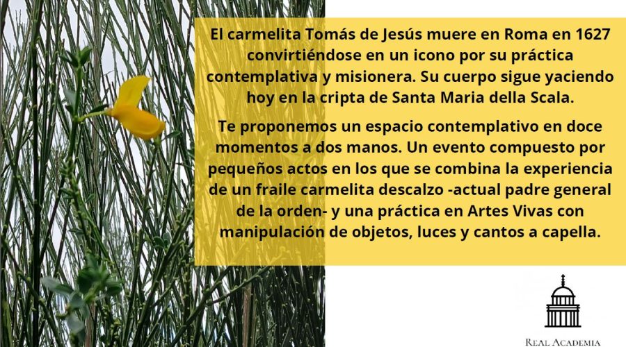 El evento dedicado a Tomás de Jesús será una conferencia performativa titulada “Tratado de Contemplación”, que tendrá lugar el 9 de junio de 2025, a las 19:30 h, en la iglesia de Santa Maria della Scala. Esta experiencia, que combina la palabra, el canto y la práctica escénica, la llevan a cabo conjuntamente el padre Miguel Márquez (actual padre general de la Orden de los Carmelitas Descalzos) y Jesús Barranco. Se trata de un espacio contemplativo en doce momentos. Un evento compuesto por pequeños actos en los que se combina la experiencia de un fraile carmelita descalzo -actual padre general de la orden- y una práctica en Artes Vivas con manipulación de objetos, luces y cantos a capella.