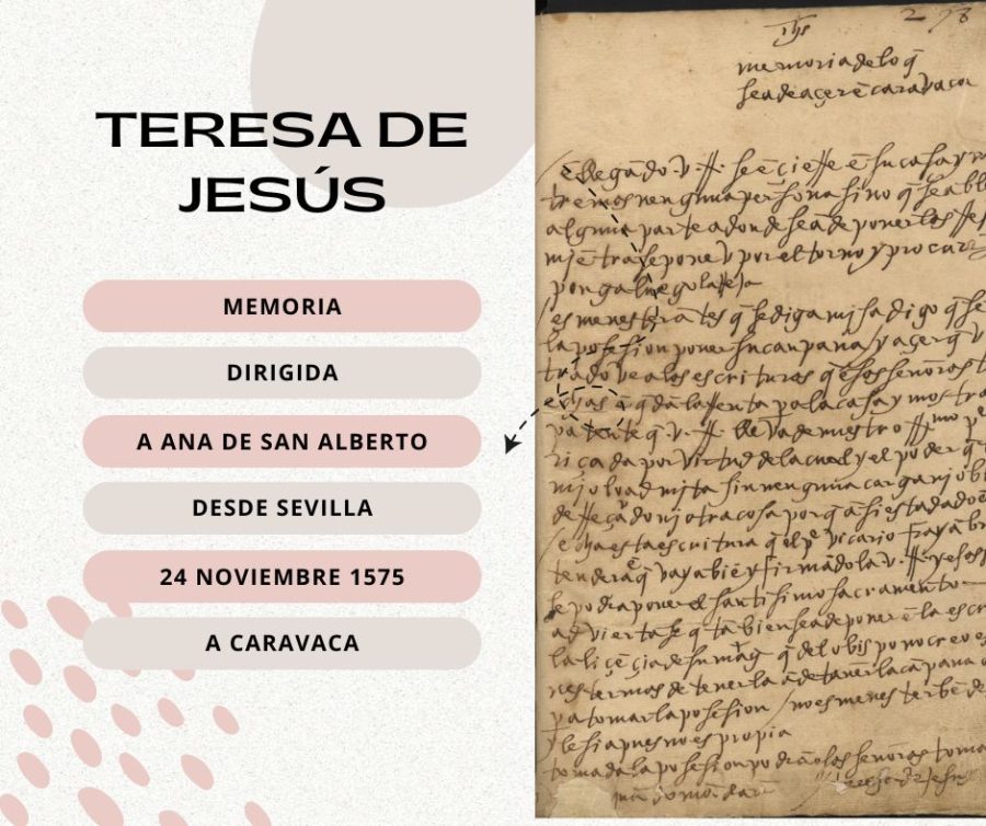 El Archivo General de la Región de Murcia ha anunciado recientemente la digitalización de un documento de especial relevancia para la historia del Carmelo teresiano: una carta autógrafa de Teresa de Jesús, escrita el 24 de noviembre de 1575, en la que da instrucciones para la fundación del convento de carmelitas descalzas en Caravaca de la Cruz. El manuscrito, que se conserva en el Archivo Histórico Municipal de dicha localidad, lleva por título «Memoria de lo que se ha de hacer en Caravaca» y está dirigido a Ana de San Alberto, priora designada por la propia Teresa.