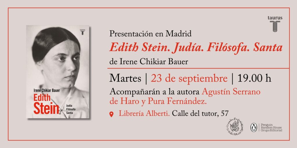 El próximo martes 23 de septiembre, a las 19:00 h, se presentará en la Librería Alberti (Calle del Tutor, 57 – Madrid) el libro Edith Stein. Judía. Filósofa. Santa, de Irene Chikiar Bauer, publicado por la editorial Taurus.
