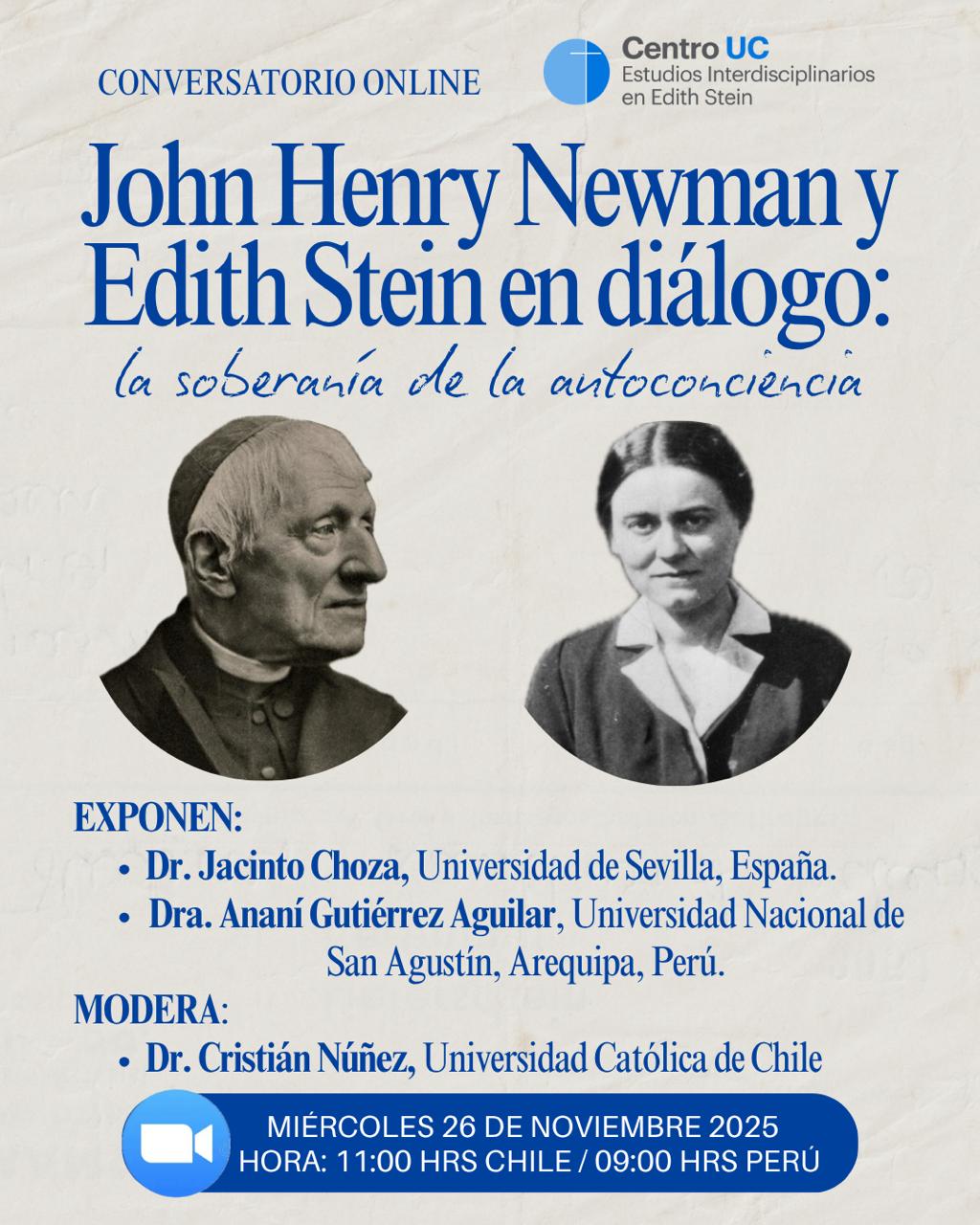 En el contexto del reciente nombramiento del Cardenal John Henry Newman como Doctor de la Iglesia, el presente conversatorio propone un espacio de reflexión en torno a su pensamiento y el de Edith Stein, dos figuras decisivas en la configuración del pensamiento cristiano contemporáneo. La reflexión se orienta a considerar la soberanía de la autoconciencia como fundamento de la dignidad y de la libertad humanas, a partir de la recepción de sus ideas en los ámbitos teológicos y eclesiásticos de la Iglesia católica.