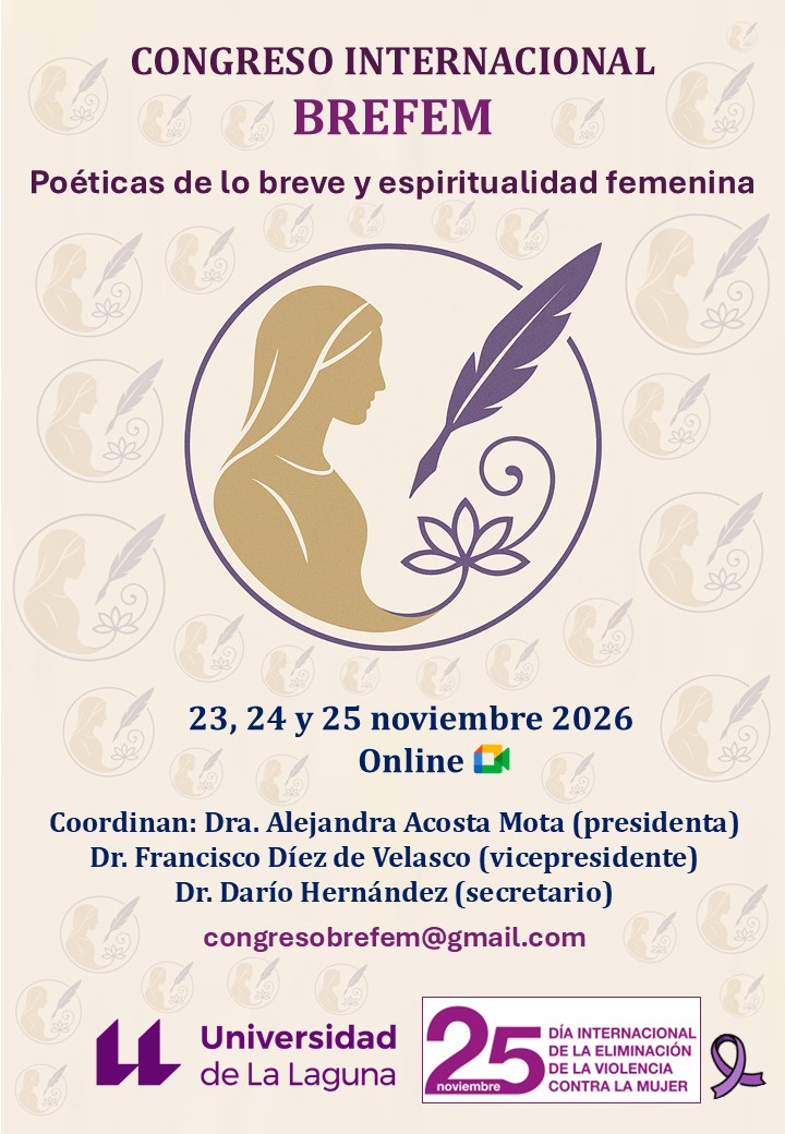 Convocatoria abierta a la recepción de propuestas de participación en el CONGRESO INTERNACIONAL BREFEM: POÉTICAS DE LO BREVE Y ESPIRITUALIDAD FEMENINA, que tendrá lugar online los días 23, 24 y 25 de noviembre de 2026, coincidiendo esta última jornada con el Día Internacional de la Eliminación de la Violencia Contra la Mujer, y que estará patrocinado por la Universidad de La Laguna.