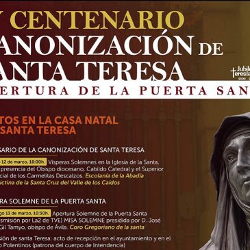 Sábado, día 5: Meditaciones de la Pasión de Cristo con santa Teresa de Jesús. Iglesia de La Santa, 18:00 horas. Interviene el Coro Gregoriano de la Santa. APERTURA PUERTA SANTA  Sábado, día 12 – Aniversario de la Canonización de santa Teresa: Vísperas Solemnes en la Iglesia de la Santa, 18:00 horas. Con la presencia del … More Actos en la Casa Natal de santa Teresa en el IV Centenario de la Canonización