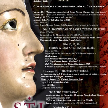 De entre las actividades relacionadas con Teresa de Jesús en este año, ofrecemos esta noticia que nos llega desde Cádiz, conectada también con la fiesta de la Virgen del Carmen: Del 7 al 15 de julio, como cada año, celebramos en Cádiz Solemnísima novena en honor de nuestra Madre la Stma. Virgen del Carmen Coronada. … More Novena teresiana a la Virgen del Carmen de Cádiz