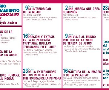 Continúa la programación del XXIII curso de Antropología Filosófica organizado por el Seminario de Pensamiento ‘Ángel González Álvarez’, de la Fundación Universitaria Española (FUE), dirigido por Lydia Jiménez. Este año, convocado con el título A los 50 años del doctorado de santa Teresa, doctora aunque mujer. El miércoles 17 de marzo, a las 19:00h., la profesora Marianne Schlosser, … More «… Esta es cosa que la da Dios». Teresa de Jesús sobre la contemplación